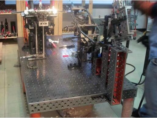 2、柔性化:三維柔性焊接平臺的承載能力高,鋼性穩定,它的五個面均加工有規則的孔,并刻有網線。焊接平臺可方便地延伸和擴展,組合。經擴展的標準臺面可模塊化的定位和夾緊直接連接在一起。在安裝、調整和定位工件過程將柔性三維組合焊接工裝系統的通用功能展示的,尤其在了大型工件方面的應用上。